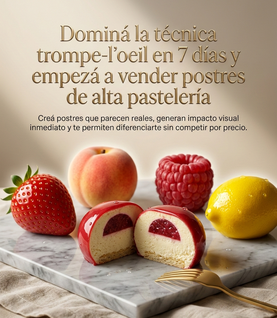 Incluye el paso a paso completo para crear postres trompe-l’oeil realistas, con más de 45 recetas detalladas, técnicas profesionales, armado, terminaciones y consejos para lograr el efecto visual impactante que caracteriza a este tipo de pastelería.
